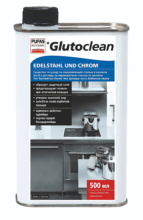 Для очистки и уходу на всех поверхностях из нержавеющей стали и хрома. Удаляет следы пользования, отпечатки пальцев, пыль, жировые и водяные пятна и образует равномерно чистую, с матовым блеском поверхность. Невидимый защитный слой предотвращает последующее загрязнение, отпечатки пальцев и появление ржавчины, а также является водоотталкивающим